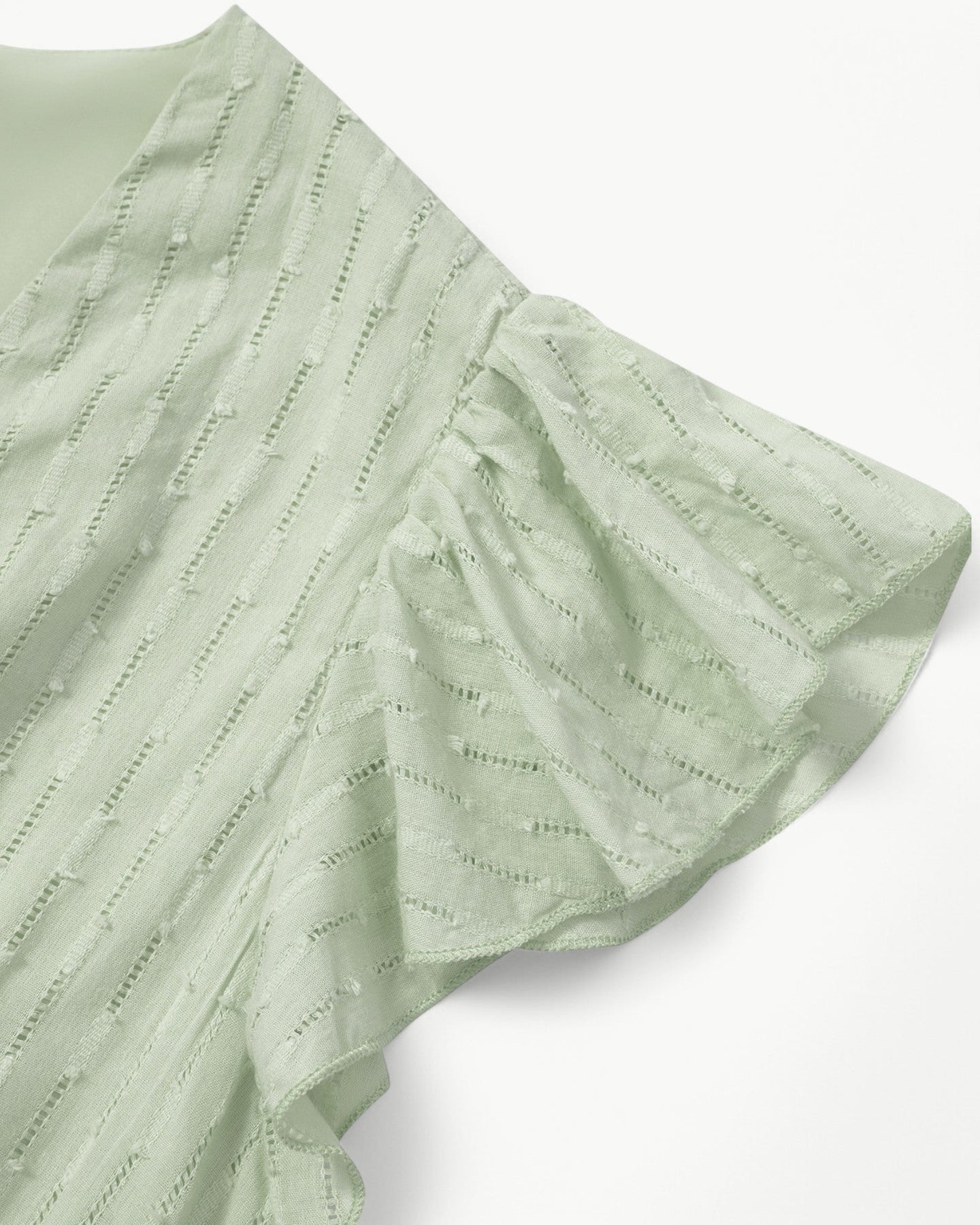 Een elegante midi-jurk met V-hals, korte ruchesmouwen en een gedefinieerde taille. De dunne textuur geeft het kledingstuk een exclusieve uitstraling, terwijl de soepele pasvorm het de hele dag gemakkelijk maakt om te dragen.