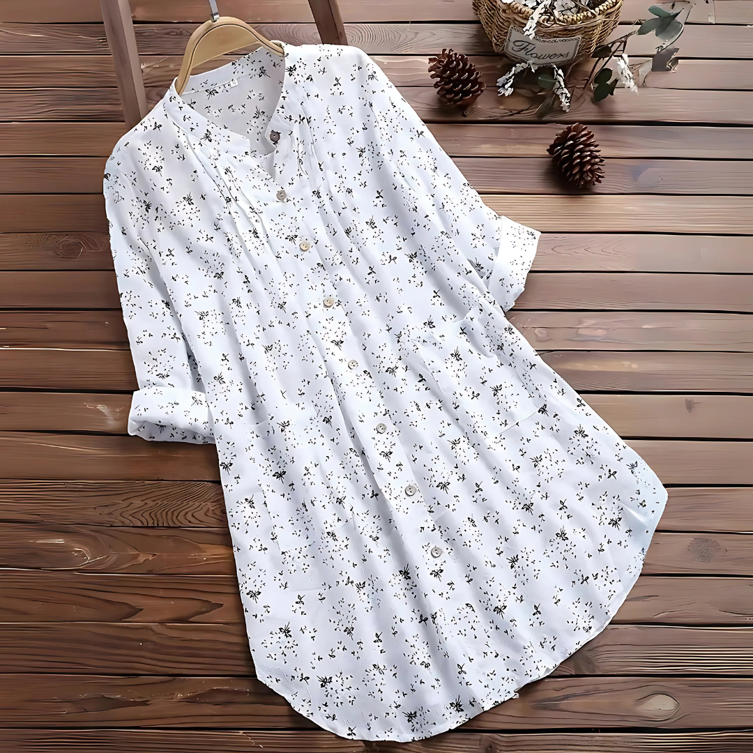 Tijdloze elegantie – De charmante bloemenprint en elegante V-hals zorgen voor een klassieke look die nooit uit de mode raakt.